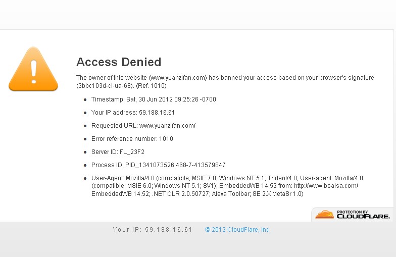 最近我的站换了CloudFlare的云加速,换上第一天后,一直收录不稳定的站忽然又有了一个百度收录。谁知到只存在1天就没了,我反复查了几次,也没找到原因,结果今天使用搜狗浏览器访问自己的博客,竟然发现提示如下界面: