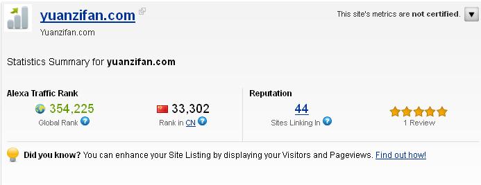 昨天我Alexa排名是世界35万,中国4.4万。今天查一下,世界还是35万,中国变成了3.3万名。