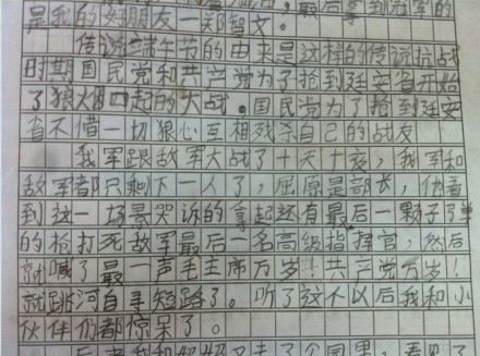 这文章来路不详,传说是一名小学生的神来之笔,看笔迹很有可能是文化水平不高的人写的,首先字体很不成熟,另外把“延安”写成了“廷安”,把“短见”写成“短路”。而且更神的是,这位小学生笔下的国民党士兵似乎都是叛徒,因为他们“不惜一切狠心互相残杀自己的战友”,残杀自己的战友啊同学们,不是残杀敌人。不过奇怪的是,国民党在不停的残杀自己的战友,共产党这边也在残杀国民党士兵,按说最后国民党应该人剩的少,但是根据这位小学生的描述,最后双方都剩最后一个人了。于是我大胆的推测,实际情况是共军这边始终只有一个人——那就是部长屈原(也不知道为什么部队打仗的领导不叫团长师长之类的,偏偏叫部长,难道只是因为叫‘部队’,所以就叫‘部长’了?)。国军那边人多,自相残杀十天十夜,才杀的剩最后一个人。不过既然最后屈原干掉了对方指挥官,又为什么要跳河?文章源自原紫番博客-https://www.yuanzifan.com/3852.html