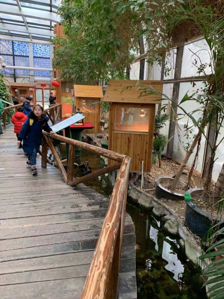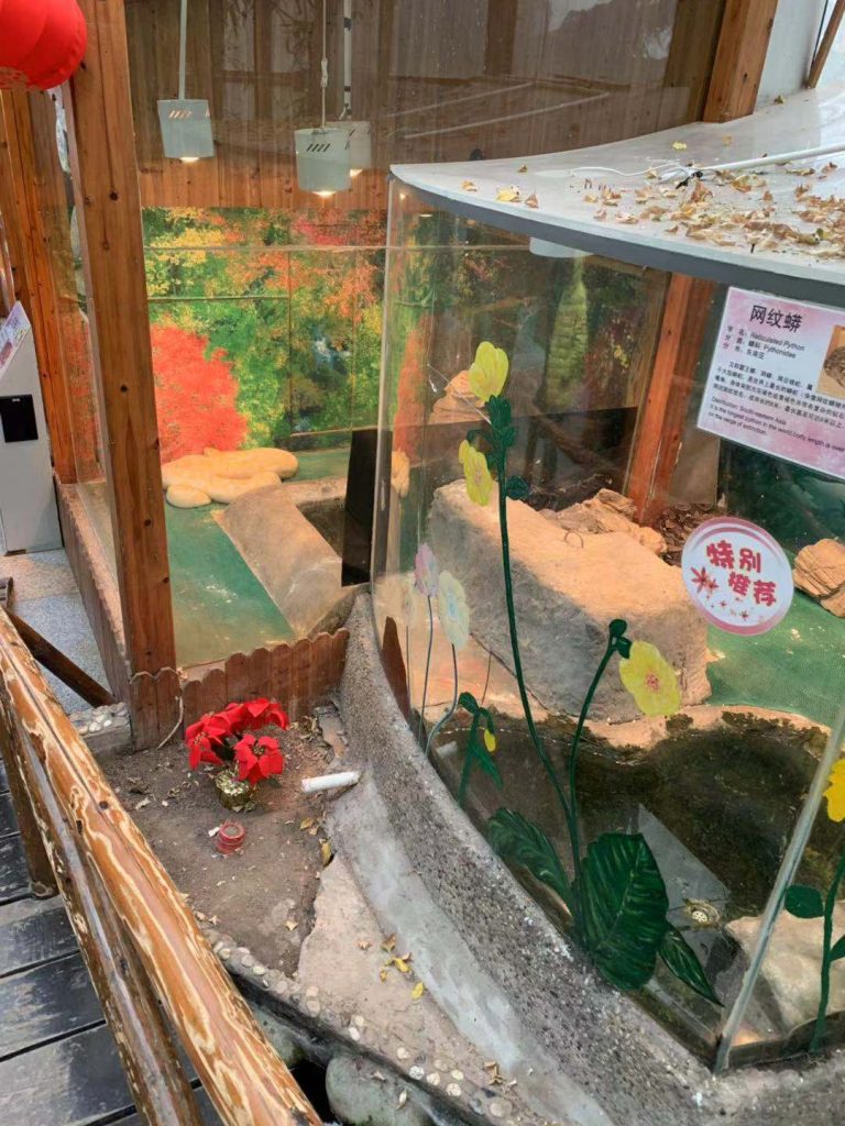 进门后,可以闻到一股子昆虫味儿——我不知道这个词该怎么形容,大体上就是有一股子腥臭味儿,不是很重,隐隐的飘荡着。里面的空间不算很大,进门经过一个木制小桥,左右两条黄金蟒,还有其他几种蟒蛇,还有一条扬子鳄,看起来有些吓人。有一阵子养黄金蟒比较流行,我实在搞不懂为什么有人爱养蟒蛇,但这东西看起来真的很吓人。