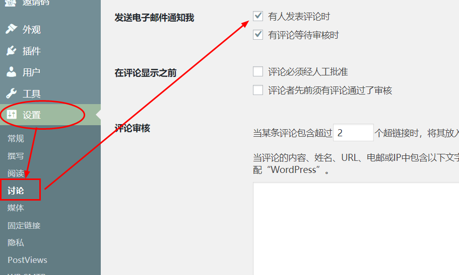 随后,来到设置-讨论中,设置允许邮件评论回复。