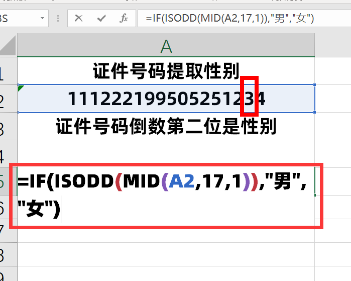 函数内容为=IF(ISODD(MID(A2,17,1)),"男","女")