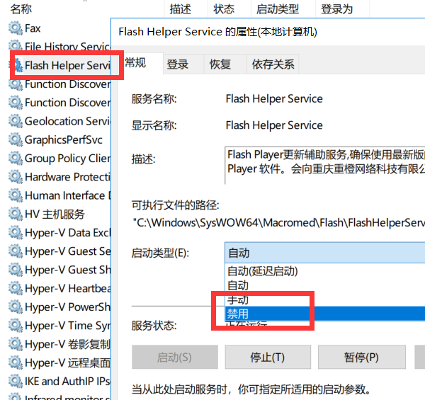 Win10系统,左下角搜索框输入‘服务’,打开服务设置。在服务里面找到Flash Helper Service.右键属性,弹窗之中点击“禁用”即可永久禁止此弹窗的弹出。文章源自原紫番博客-https://www.yuanzifan.com/53555.html