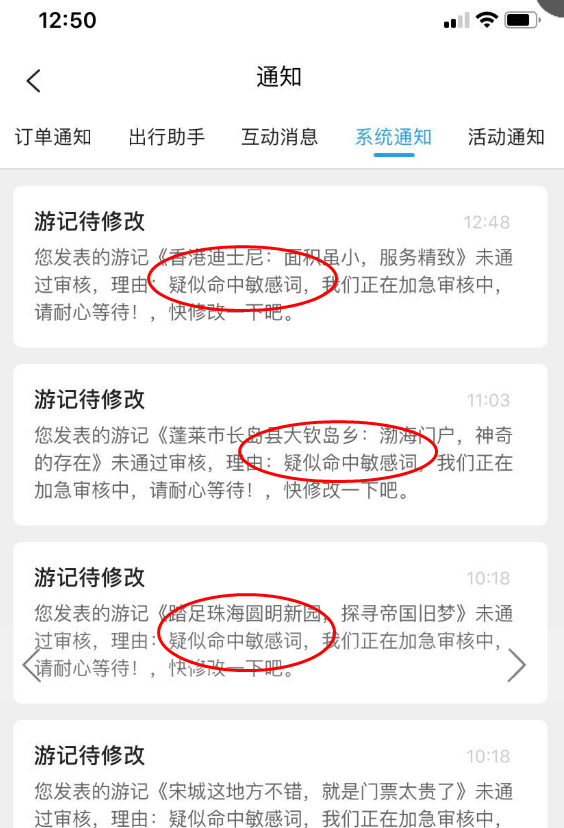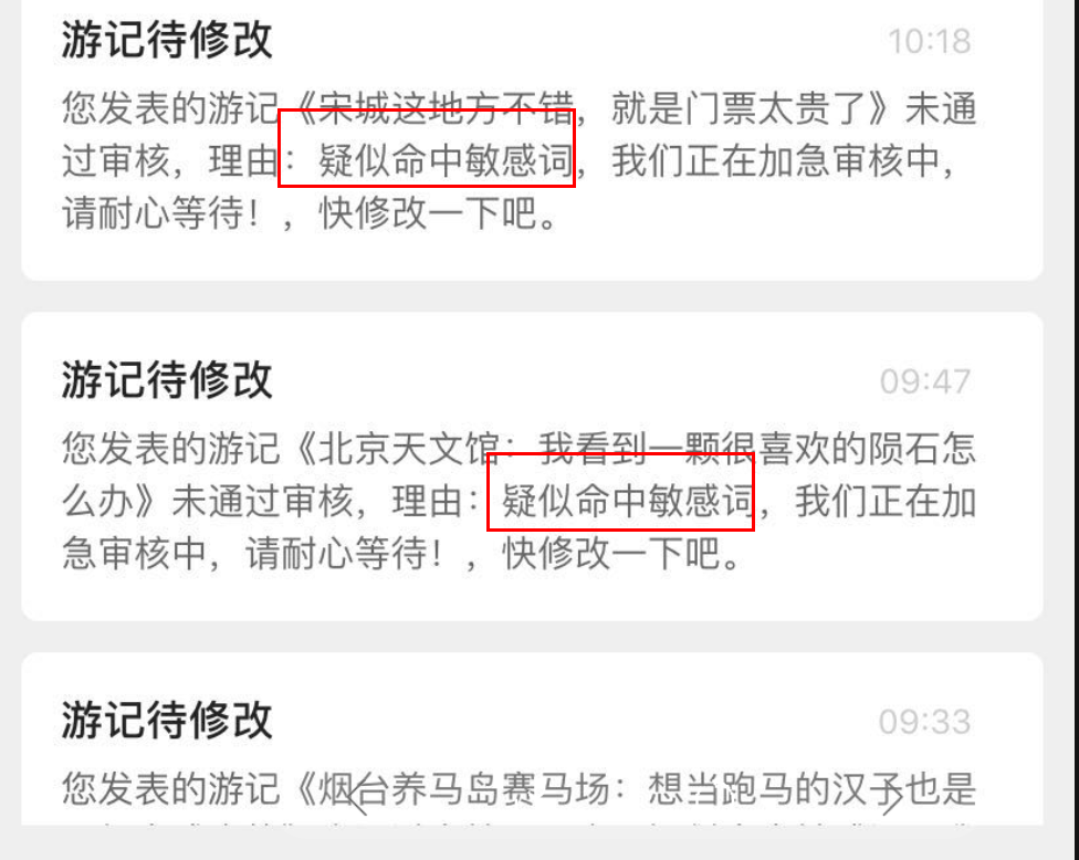 好久没登录携程,早上忽然看到有一堆提示,早些时候我在携程发布了几篇游记,大部分都是在我博客之中转发的。其实我在其他各大平台都遇到过类似的问题,十年之前就是因为受不了这种敏感词的奇怪问题选择独立开通博客。因为在有一段时间,敏感词特别离谱,比如在小说中写了一个“与野兽交手。”因为包含了“兽交”被检测敏感词,找了好久好久都找不到。至于什么“港口交通”之中包含了“口交”,这样的问题,更是叫人哭笑不得。