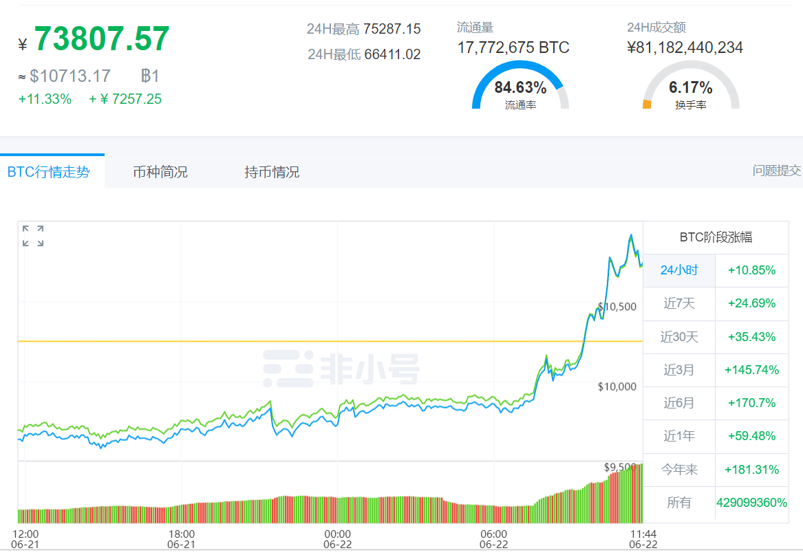 6月21日晚间,比特币在前期突破8000美金后一度陷入盘整和下跌通道,在横盘一周左右,再次发力上冲。2019年6月22日中午12:00左右,比特币已经冲破1万美金心理关口。