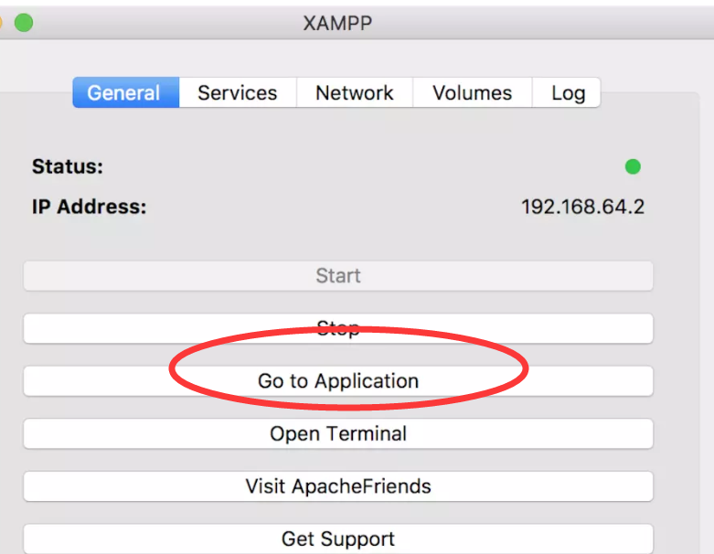 服务启动以后,到GeneralTab下,点击GotoApplication。就可以打开XAMPP的面板。