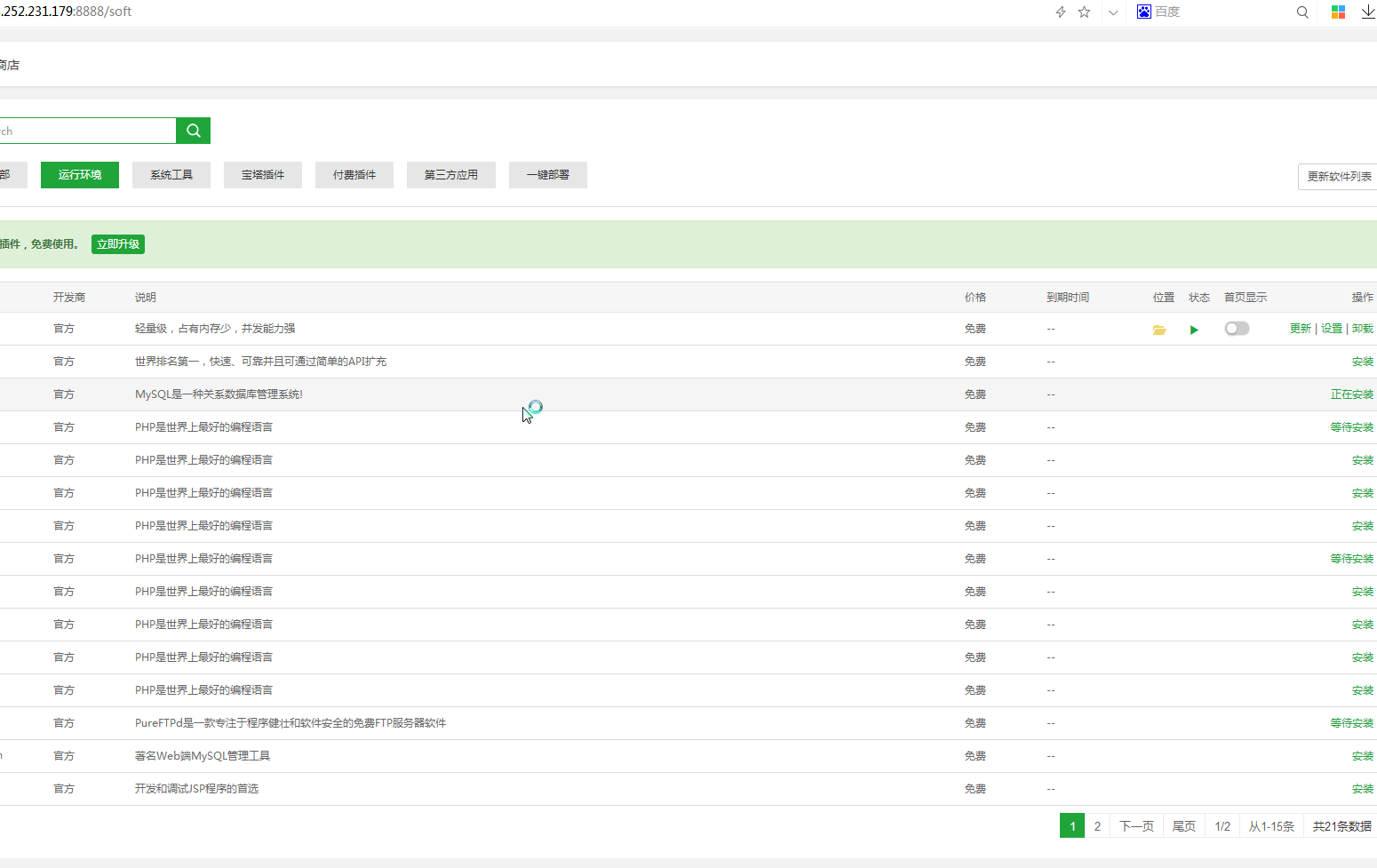 系统版本号为CentOs7.5.1804。安装Nigix,MySQL后,提示安装成功,但是在软件列表上无法看到这些软件,点击创建网站,显示您需要先安装服务器。与之对应的,系统的硬盘也并没有增加,也就是说所有安装只是表面上执行成功,但尚未暗转完成。