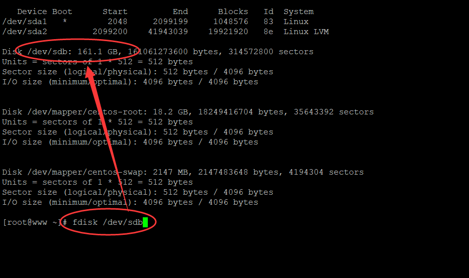 输入fdisk -l列出所有硬盘。这里可以看到,主机上有一个161G的空间,没有硬盘识别码。因此也就意味着尚未挂载。输入 fdisk /dev/sdb对该磁盘进行分区。文章源自原紫番博客-https://www.yuanzifan.com/54007.html