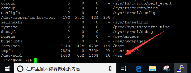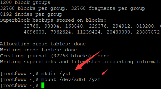 mount /dev/sdb1 /yzf 把刚才分区且格式化好的文件,放在yzf文件夹下。