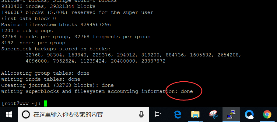 这里注意,格式化需要一个过程,其耗时取决于主机配置、网络环境等因素。在显示出 writing superblocks and filesystem accounting informaiont:的时候,如果后面没有出现done。则说明还在格式化中,这个时候先不要操作。