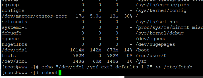 echo "/dev/sdb1 /yzf ext3 defaults 1 2" >> /etc/fstab