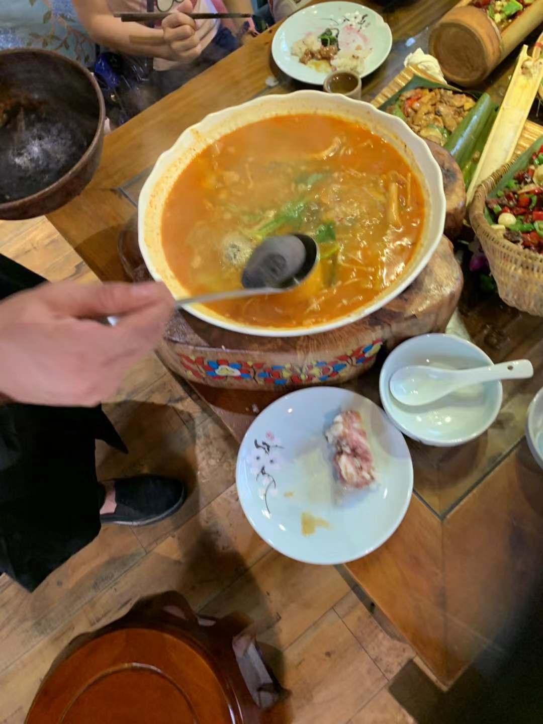 竹筒牛肉,芋头排骨——我不记得那个排骨的名字了,只记得是跟某种植物的混合。口味非常不错。还有一道特色菜,酸汤鱼——酸汤鱼不算特色是不是?云贵特色,没毛病。至少和东北常见的酸汤鱼很不一样,因为这个用石头烤的:先上一盆汤,再放滚烫的石头加热,再放鱼肉、蘑菇、葱花辣椒香菜:文章源自原紫番博客-https://www.yuanzifan.com/54105.html