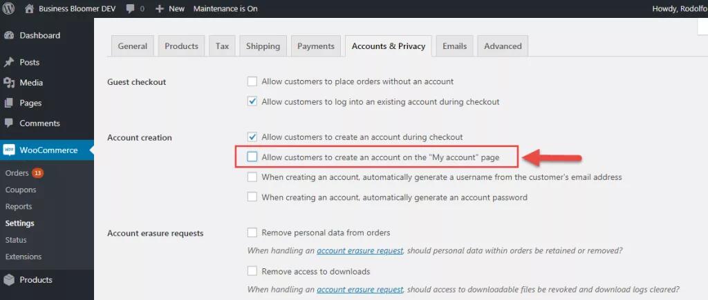 woocommerce在“我的账户”页面下,默认是可以进行注册的,但是某些主题因为设置的原因,注册按钮消失。其实只需要打开woo的设置界面,找到账户和安全,将“允许用户在我的账户界面注册”选项勾选,即可恢复注册功能。文章源自原紫番博客-https://www.yuanzifan.com/54584.html 文章源自原紫番博客-https://www.yuanzifan.com/54584.html