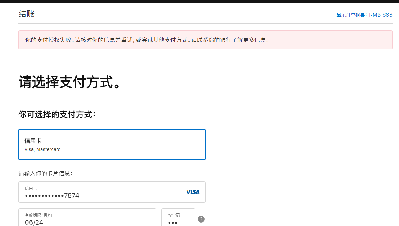 你的支付授权失败。请核对你的信息并重试,或尝试其他支付方式。请联系你的银行了解更多信息。