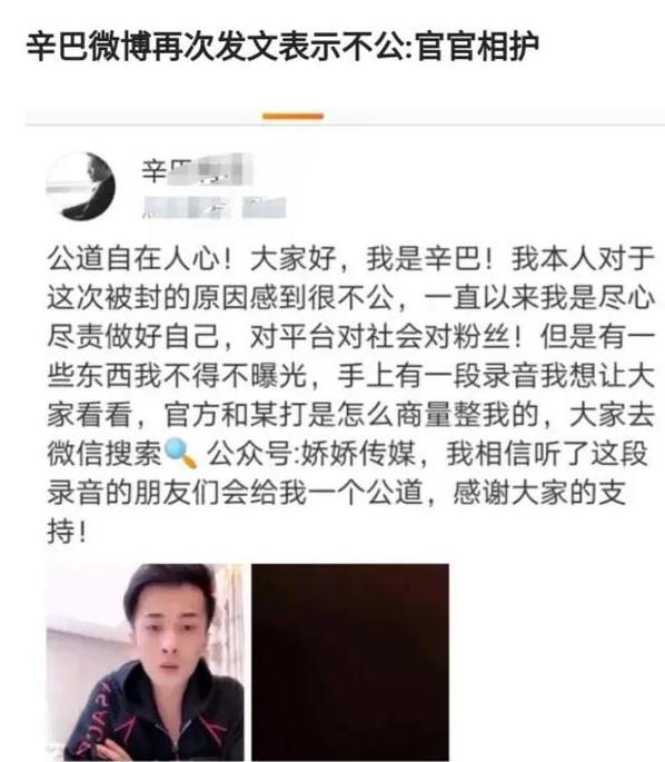 最后,事情终于闹大,期间有一段时间辛巴和散打在快手平台似乎有什么纠纷,闹得大家都知道。辛巴后来在微博发了个什么评论说手里有录音,似乎是在喊冤。