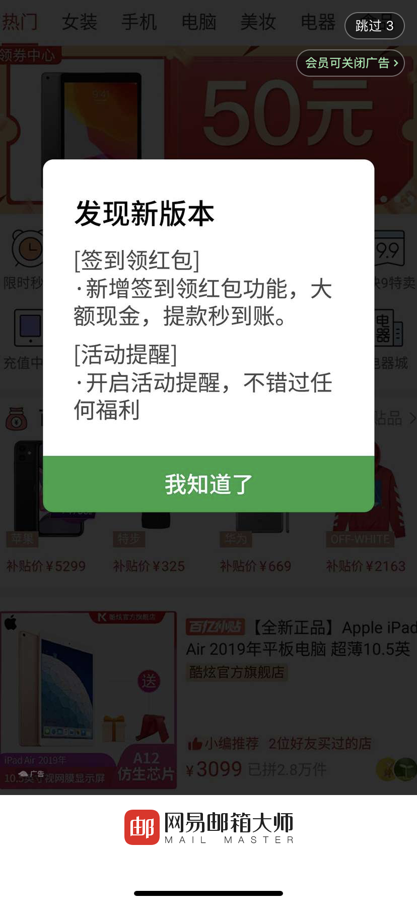 每当我小孩玩手机看抖音的时候,手机里都会下载好多各种软件,其中拼多多最常见。可能是因为小孩子更容易被引导点击某些特定链接。但是忽然有一天我也上当了。简直是防不胜防——正常来说,网易邮箱大师的广告是这样的——