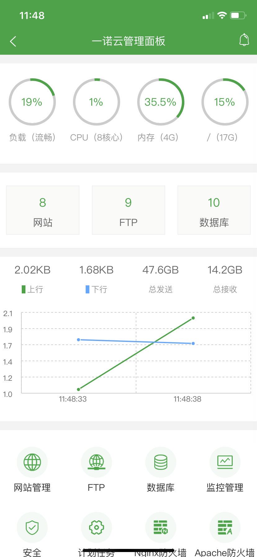 随后,打开手机,在APP Store或者安卓市场,下载堡塔APP,这个APP安装后,可以扫码,直接扫码对服务器进行绑定。绑定后可见管理界面:文章源自原紫番博客-https://www.yuanzifan.com/54971.html