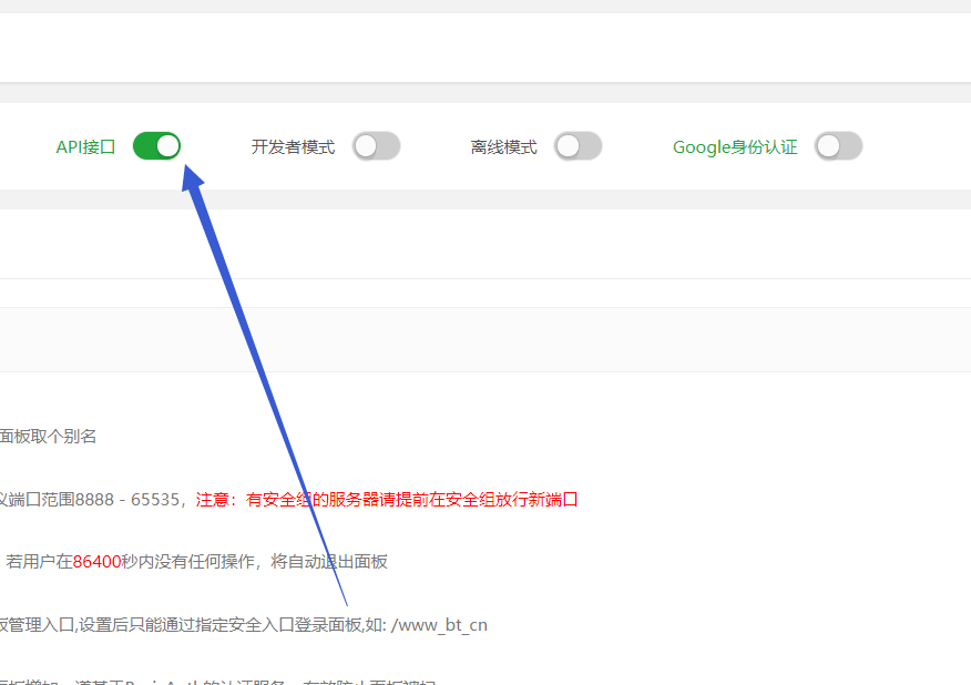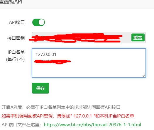 打开API接口开关后,需要设置API接口的具体ip,堡塔是运行在本机的,所以添加127.0.0.1和服务器的本机IP即可。