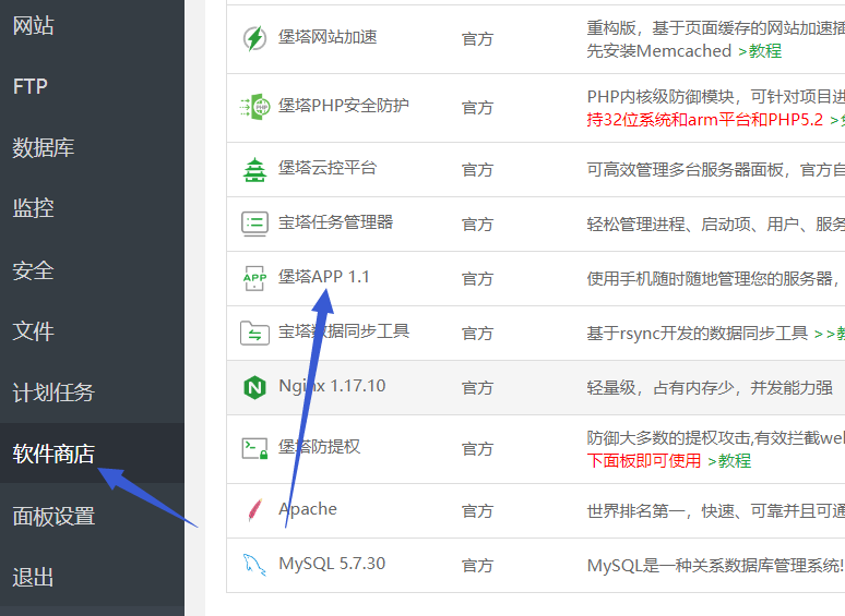 然后,打开后台软件列表,找到“堡塔APP”,并安装: