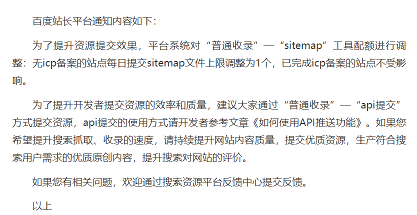 2021.5.22最新消息,百度站长平台宣布限制非备案网站sitemap配额。