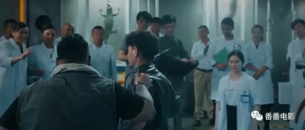 注射成功,大家击掌庆祝,为首的秃顶科学家,你记住他,他演的是反派。为什么这么说呢?因为这个角色莫名其妙的就必须是反派,没有任何铺垫的就开始各种自私自利落井下石。