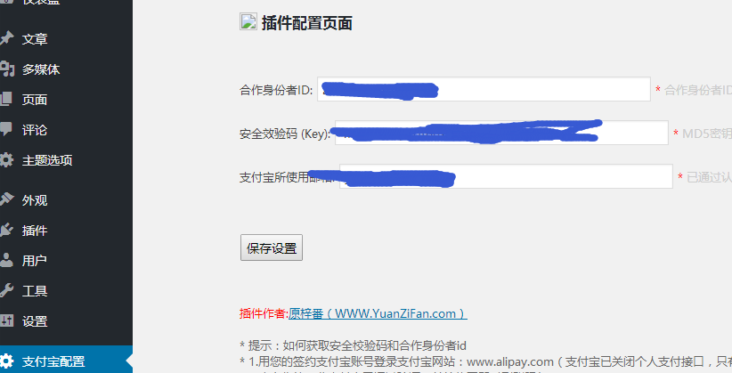 2.插件启用后,后台可见‘支付宝配置’菜单,点击后,设置支付宝的PID,Partner等信息,需要注意的是,支付宝已经关闭了个人用户申请PID的功能,所以,目前只有企业用户才能申请到。
