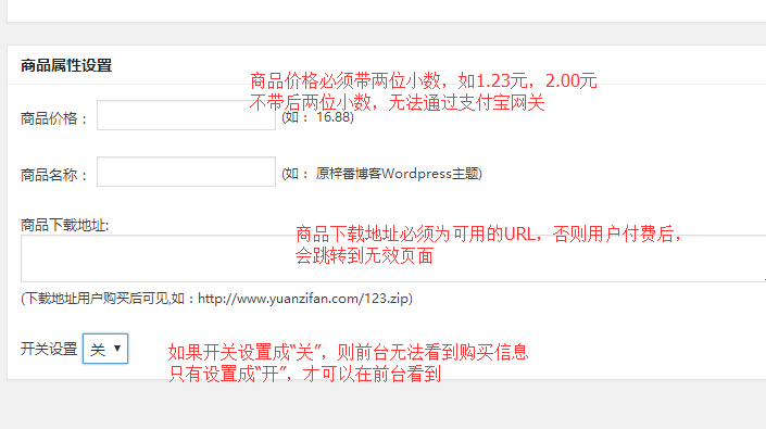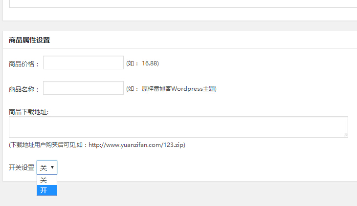 3.创建成功后,在新建文章页面,可见下方多了如下几个单元格。需要注意的是,商品价格必须带2位小数,商品下载地址必须可用,否则客户付款之后无法跳转到正确的地址。