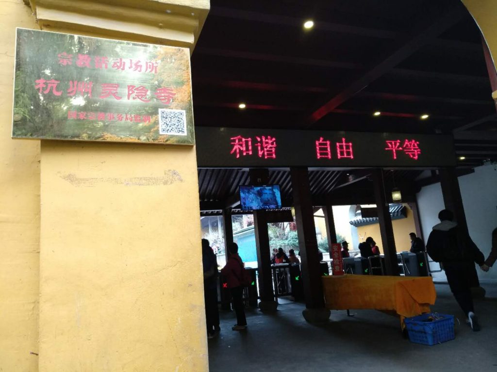 因参加杭州西溪影人会,得到了半天的空闲游览时间。所以参观了杭州灵隐寺,灵隐寺的飞来峰景区和寺庙的门票是分开卖的,灵隐寺单独的票价是30元。在售票口,我看到LED显示屏上滚动显示的是社会主义核心价值观共计24个字的内容。