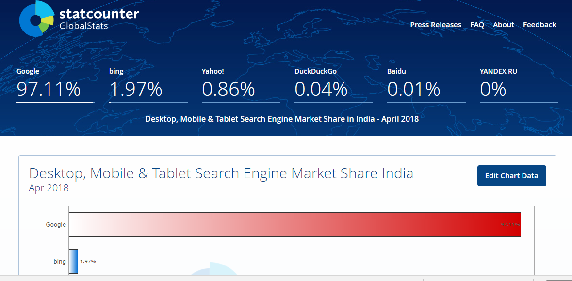 而在看看拥有世界第二大城市孟买,号称IT大国的印度,他们的搜索引擎占有率: