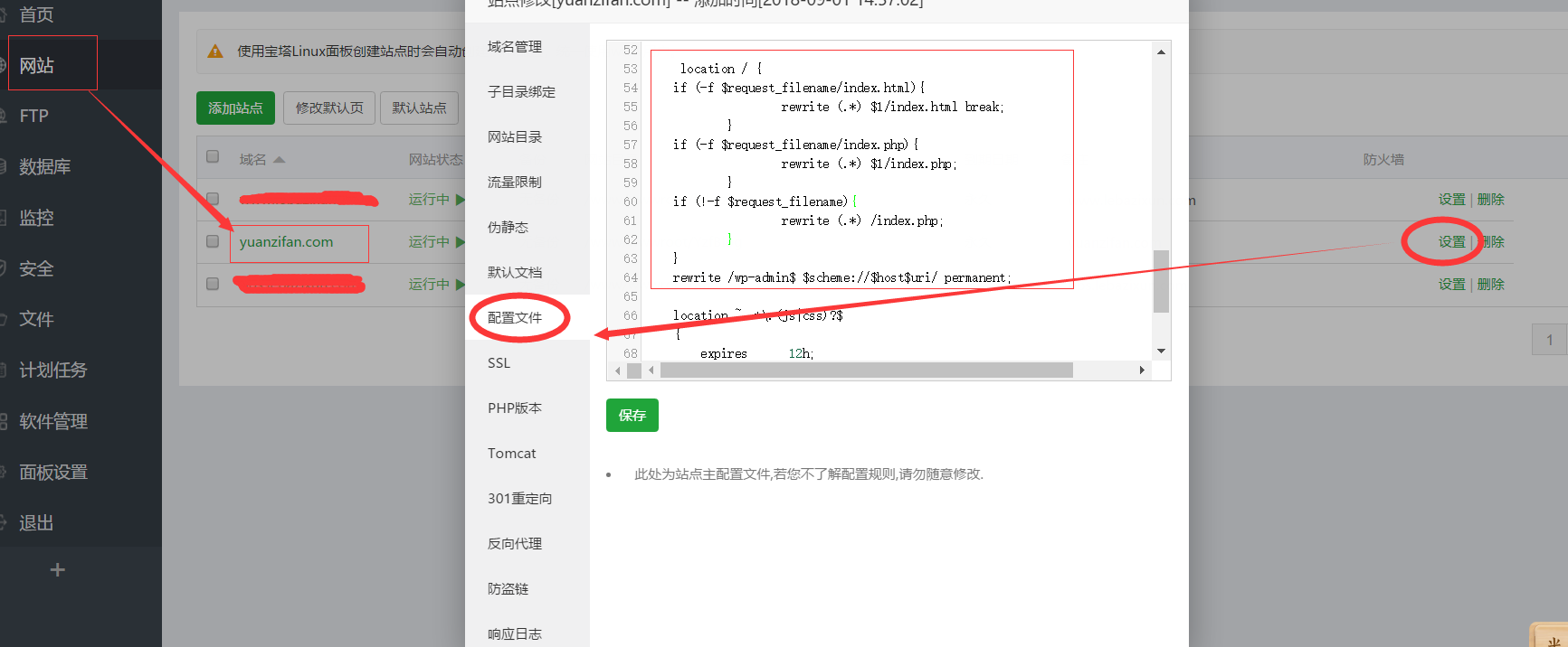 登录宝塔后台,点击左侧“网站”,选择你要调整的网站,点击“设置”,弹窗后在弹窗上点击‘配置文件’(如下图),在配置文件中添加下图红框中的代码。
